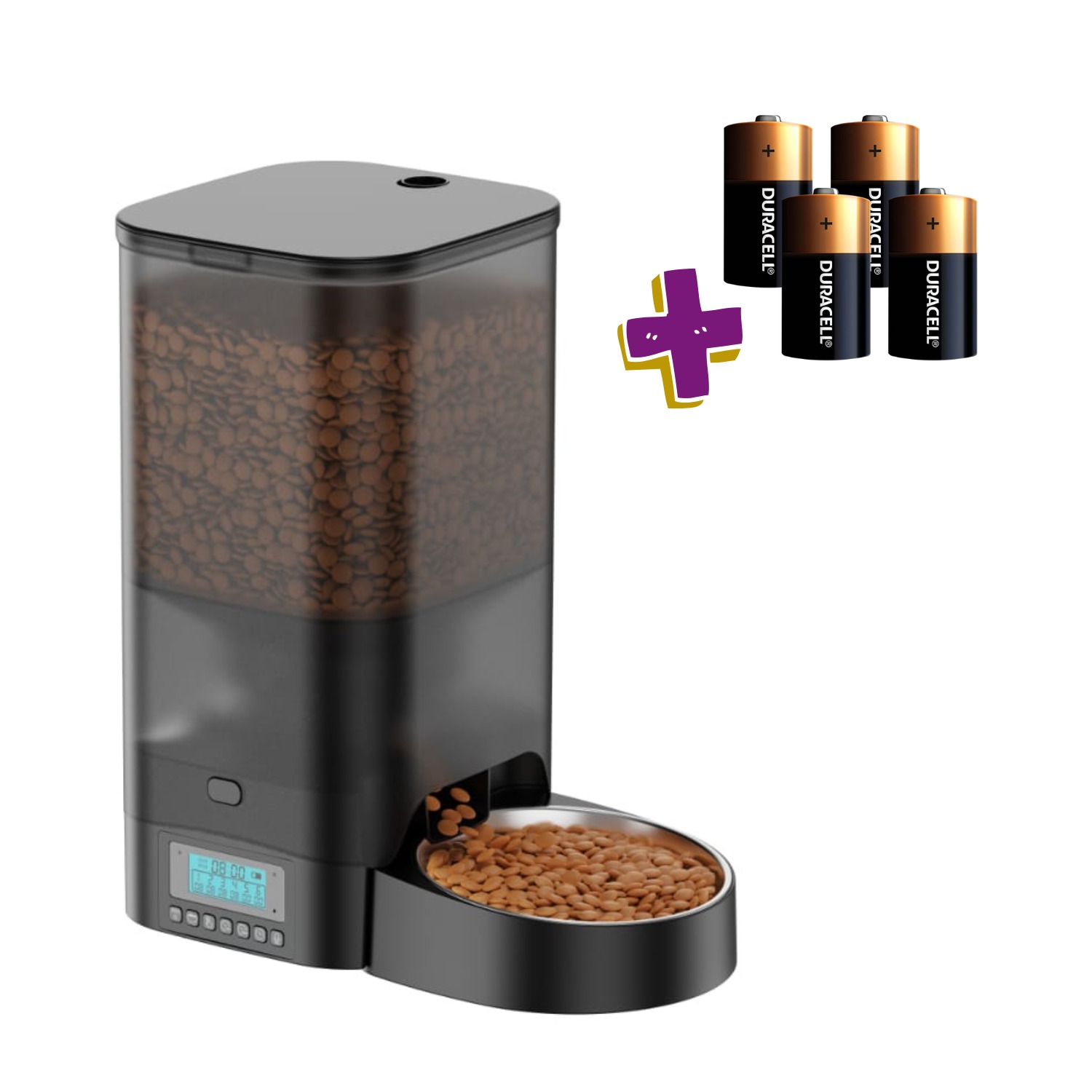 - Contenedor translúcido para ver el nivel de comida.